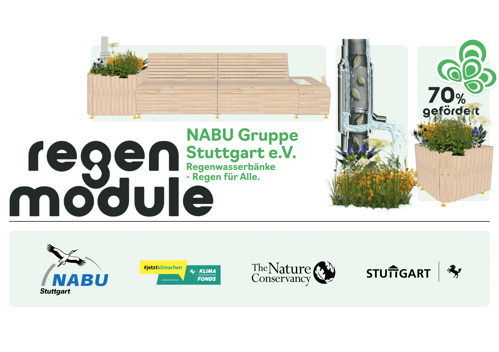 Wir freuen uns riesig über den Start des Projekts “Regenwasserbänke - Regen für Alle”! Die Förderung vom Stuttgarter Klima-Innovationsfonds und The Nature Conservancy macht möglich, unsere Vision für ein Klimaresilienz und Lebenswerten Städten in Stuttgart weiter voranzutreiben. Im Rahmen unseres Projektes werden wir in den kommenden zwei Jahren 10 Regenwasserbänke in Stuttgart aufstellen. Der Fokus liegt dabei auf Schulen und Kitas. Mit der NABU Gruppe Stuttgart e.V. als Projektpartner entsteht dabei kindgerechtes, pädagogisches Begleitmaterial und erfahrungsbasierte Bildungsformate rund um das Thema Regenwasser. So werden Umweltbewusstsein und Klimakompetenz von Klein auf gestärkt und unsere Regenmodule zu Open Air Klassenzimmern.